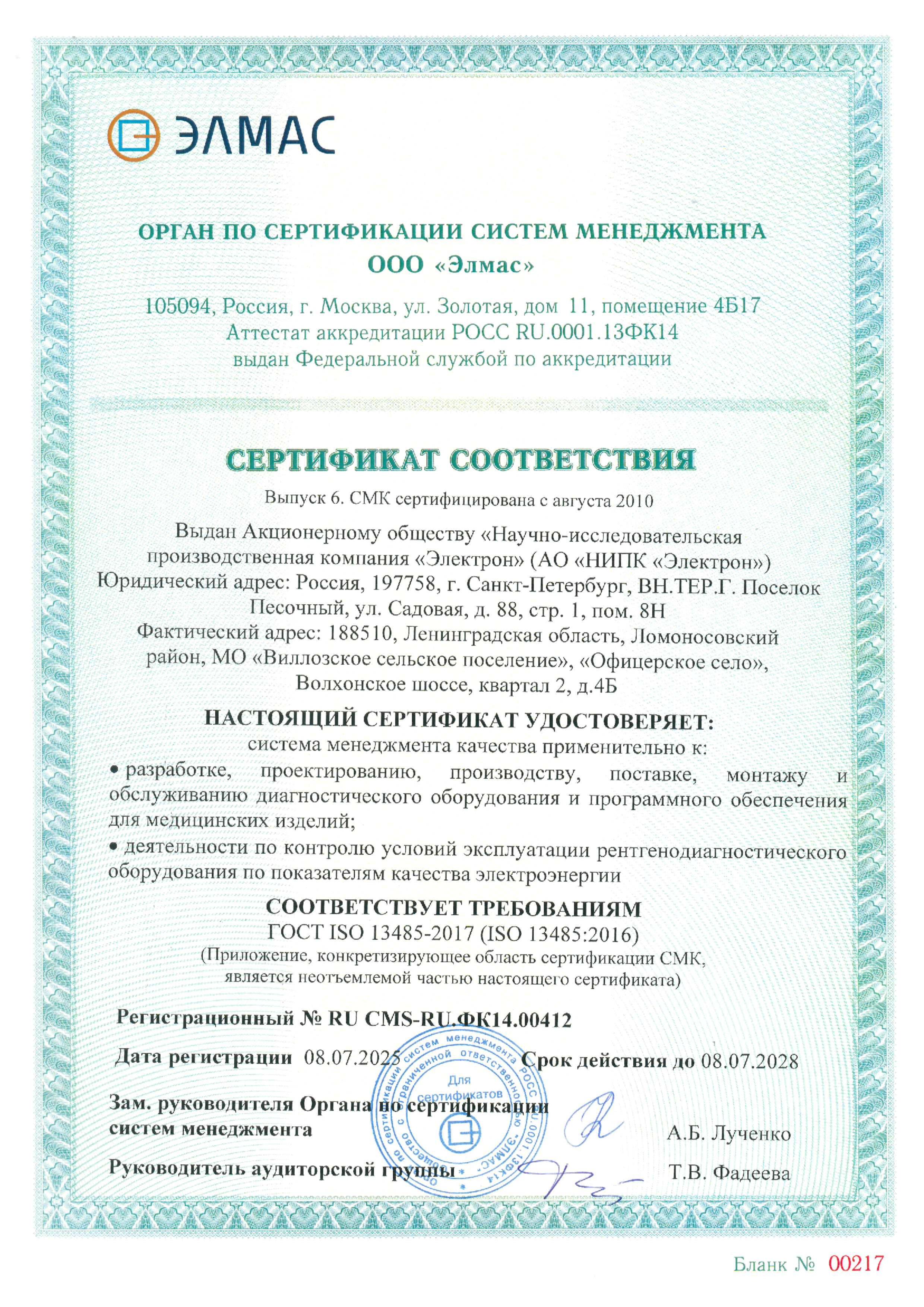 С 2007 года СМК была сертифицирована европейским нотифицированным органом SGS на соответствие требованиям ISO 13485.