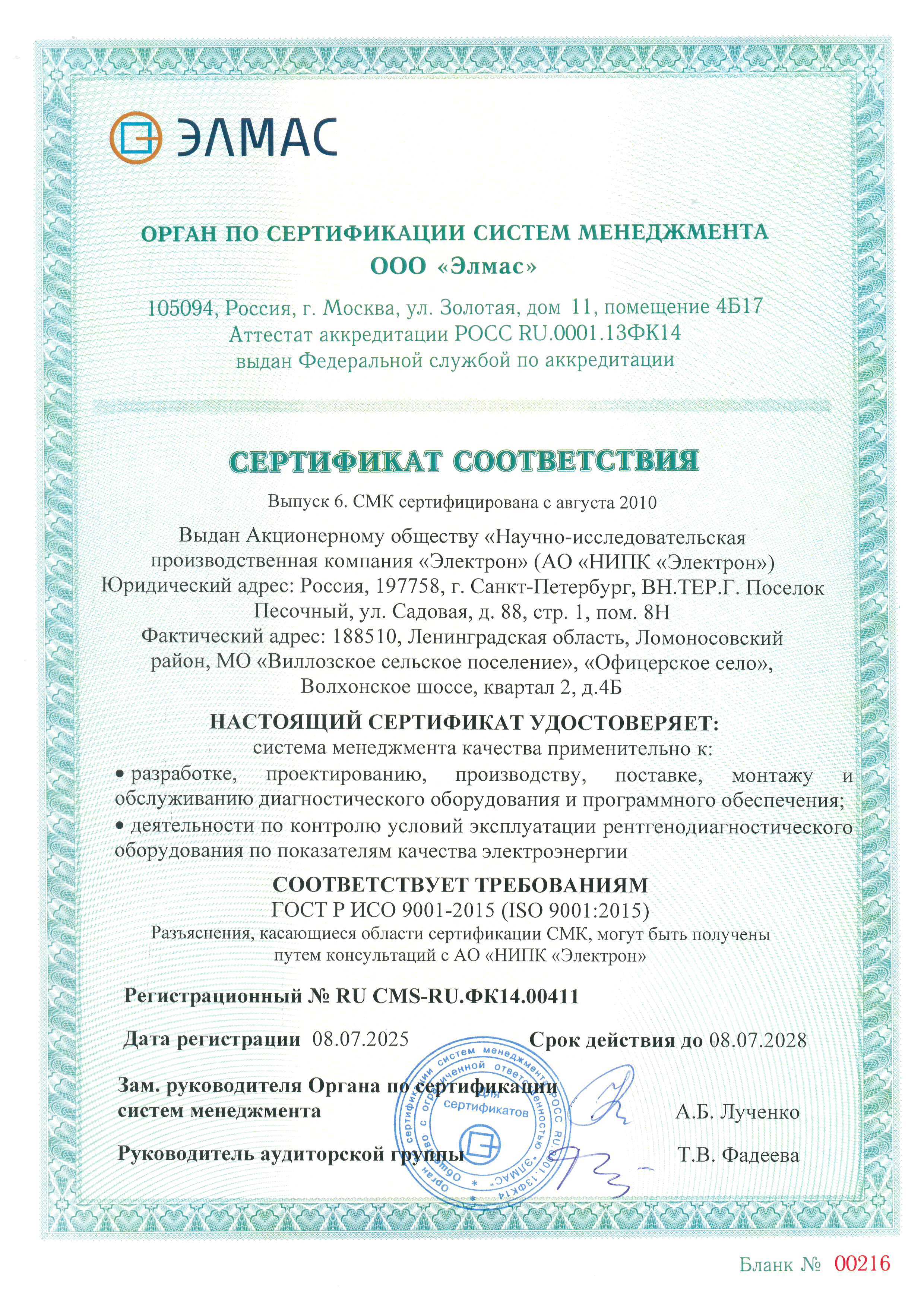 Наличие сертифицированной системы менеджмента качества подтверждается на ежегодных аудитах, проводимых сертификационным органом ООО «ЭЛМАС».