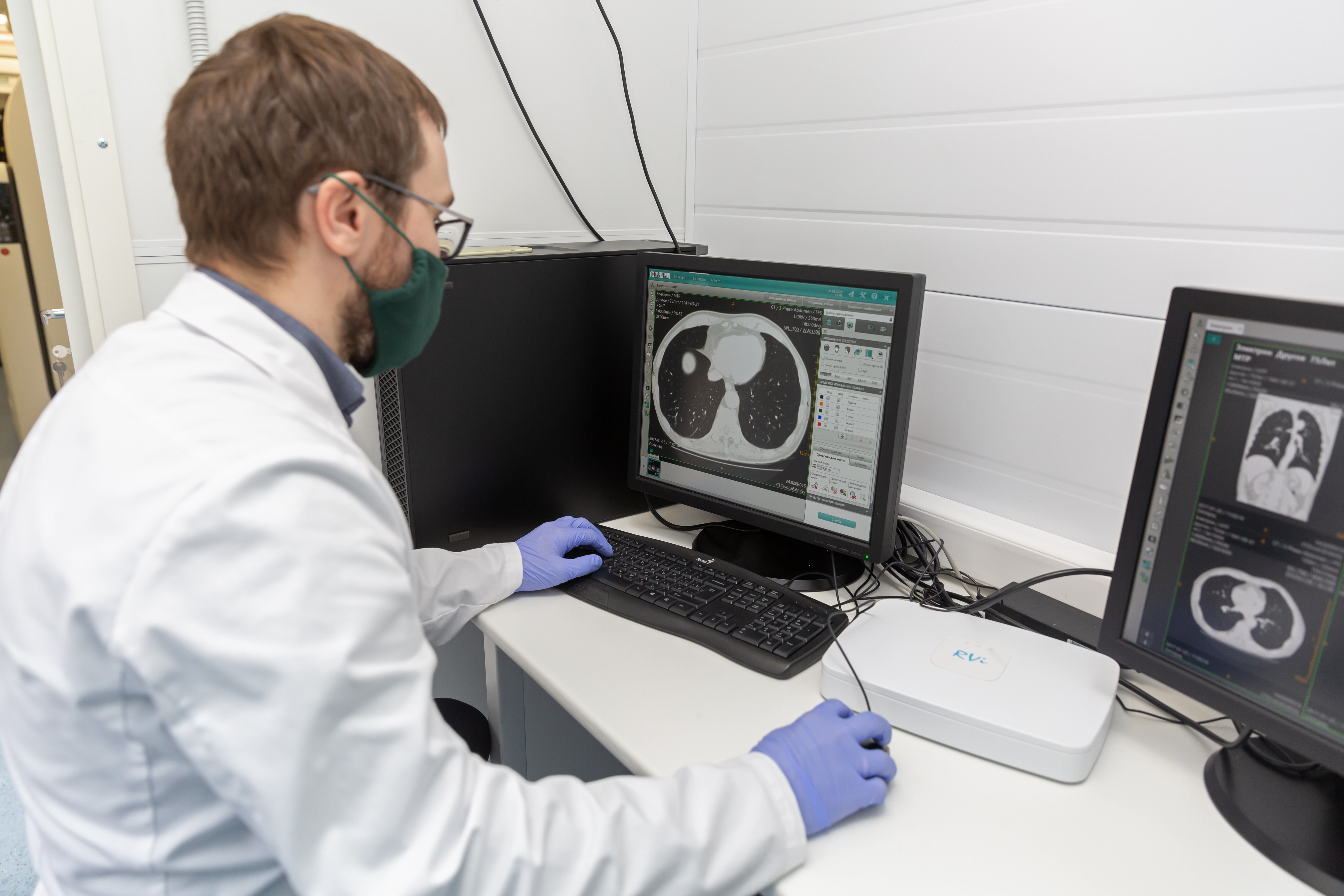 • the computed tomography system 64-slice manufactured by NIPK Electron Co. for primary assessment and differential diagnostics of chest diseases, as well as for revealing concomitant diseases. The modular CT unit can be equipped with a computed tomography system with another slice number as an option. According to the interim methodological guidelines “Prevention, Diagnostics, and Treatment of a new Coronavirus Infection” developed by the Ministry of Health of Russia, a CT scan is considered one of the basic methods of COVID-19 diagnosis.