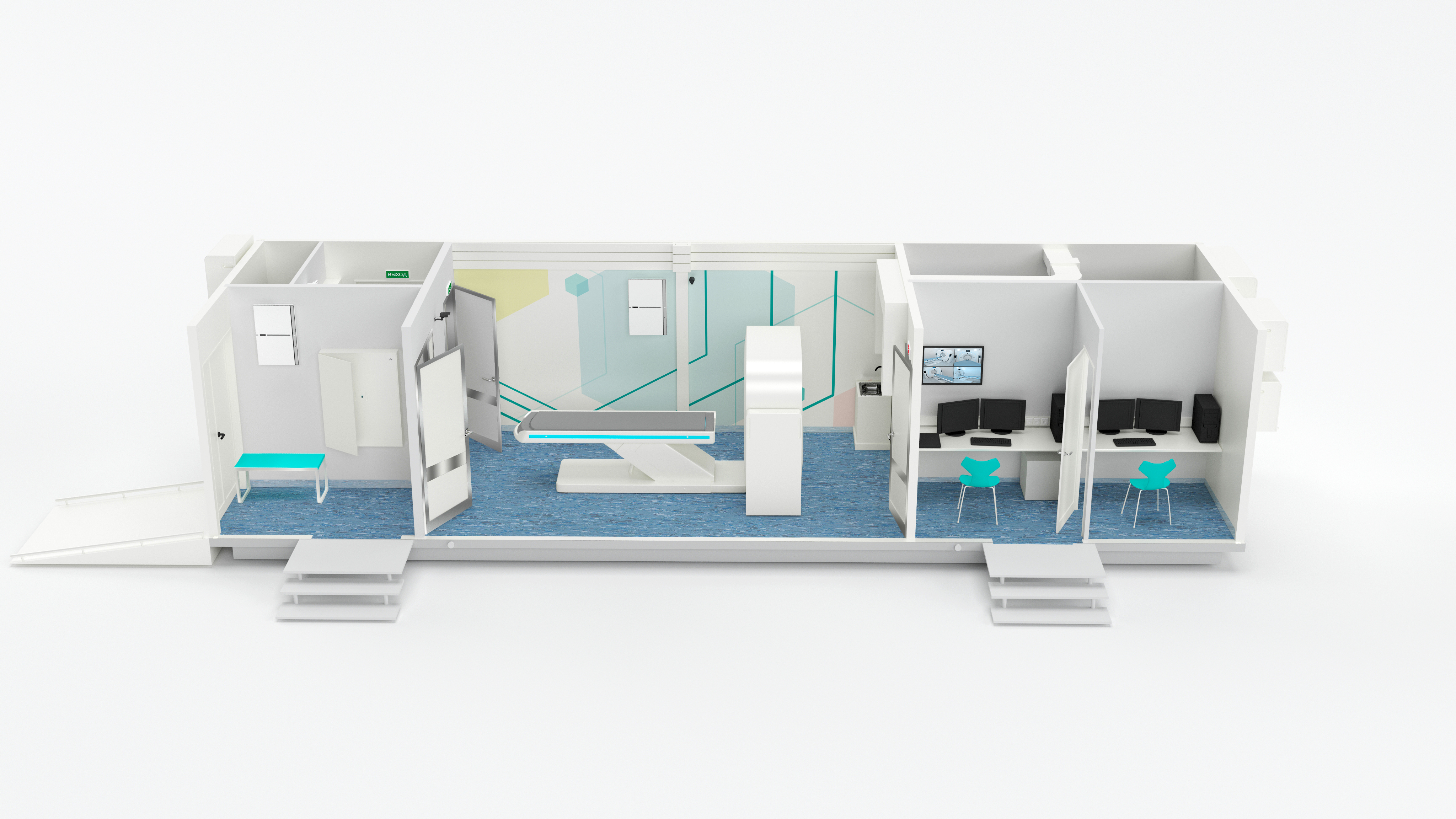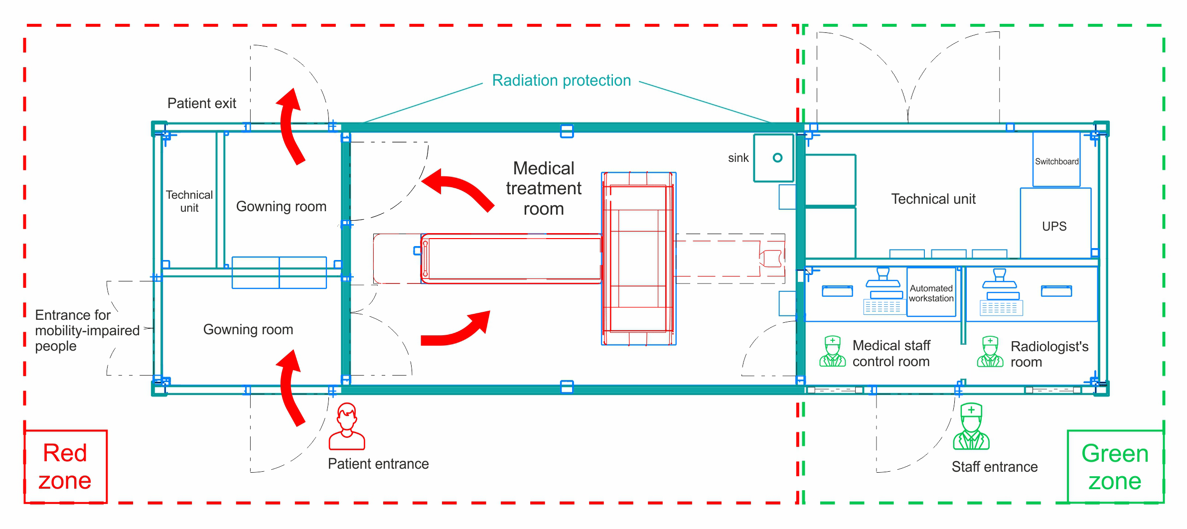 • Elaborated patient routing. All rooms of the module-unit are divided into the “red” and “green” zones, which exclude direct contact between the patients and the staff. The patients stay in the “red” zone, while workstations of the radiology technician and the radiologist are located in the safe “green” zone
