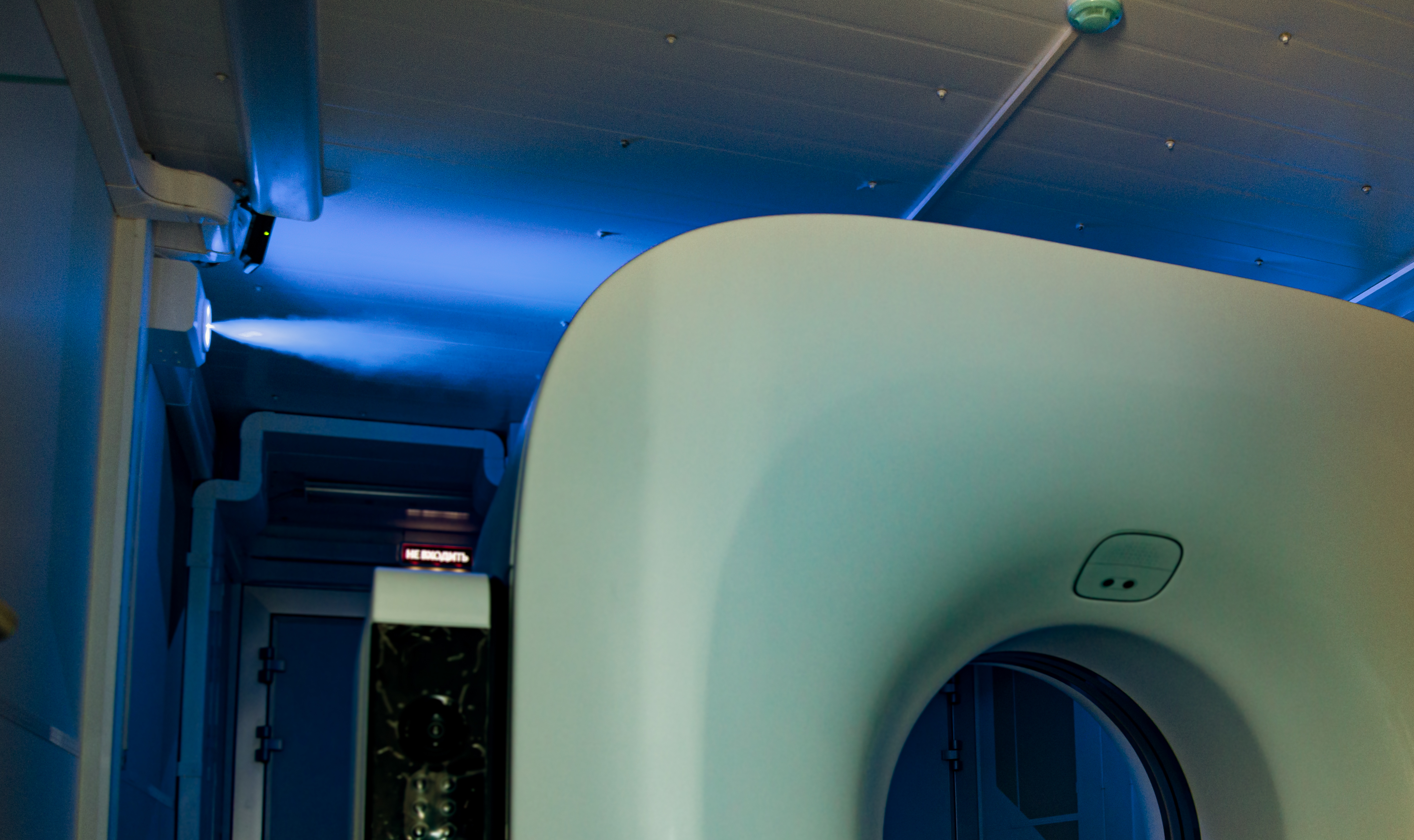 Innovation disinfection system- For the maximally effective disinfection, two simultaneously operating disinfection systems are provided in the module unit: the aerosol system (spraying the ClO2 solution through nozzles in the “red” zone) and ultraviolet air recirculation units. After completing a disinfection cycle in the “red” zone, the air is conditioned and dried by a powerful ventilation system which replaces the air fully and removes moisture left after spraying. It is possible to use the systems in the automatic mode to increase the throughput (the operation frequency is set in advance when commissioning the modular CT unit). СA technician controls the system directly from his/her workstation.