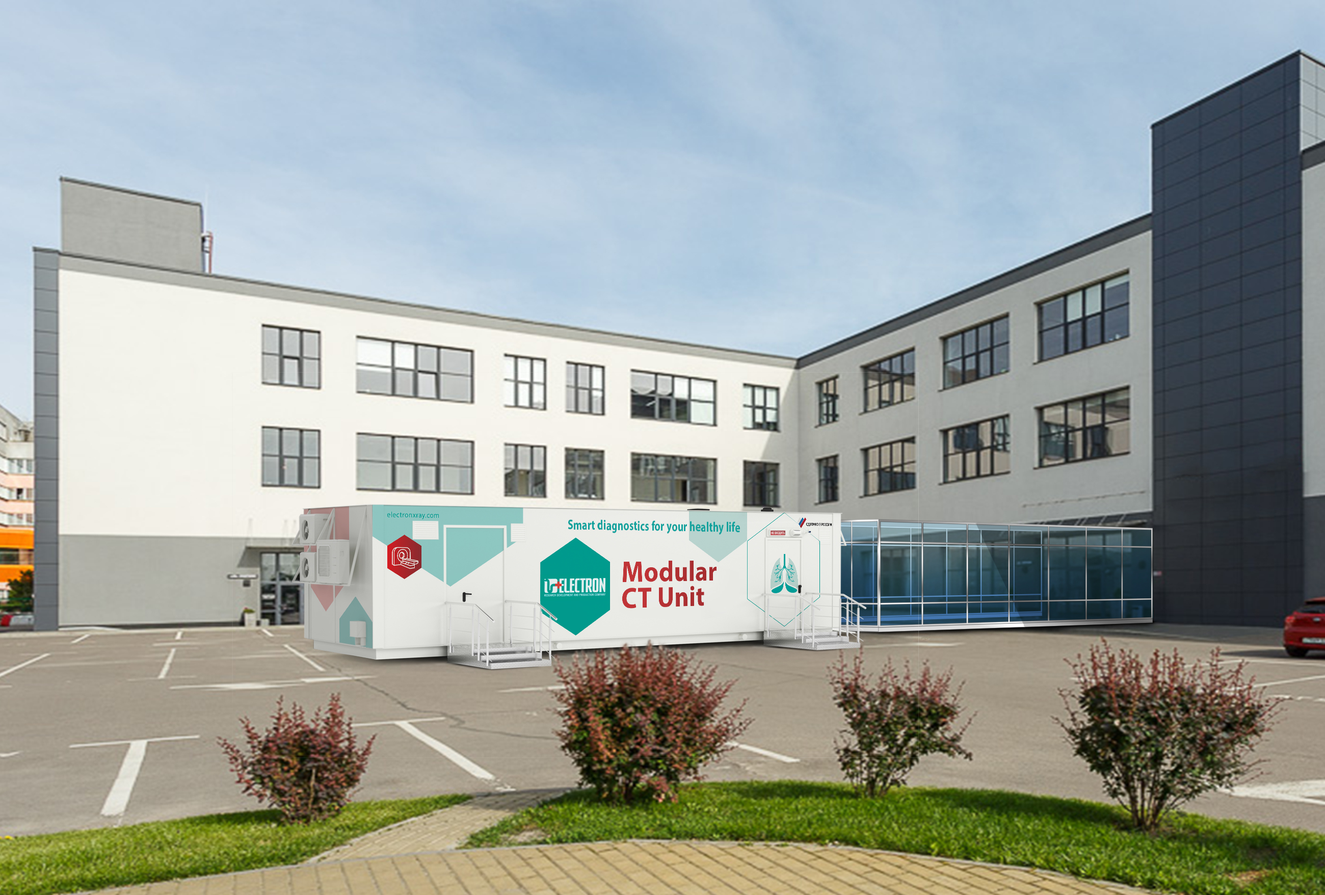 The tomography system is equipped with all modern programs and algorithms to perform examinations with the minimum exposure dose and breath-holding for the shortest possible time. The module shall be transported in a road trailer and installed in any required site; it can be deployed within several hours. The location of the modular CT unit can be changed at any time. If necessary, it can be connected with the main building of a healthcare facility, which allows using it as a permanent CT room.